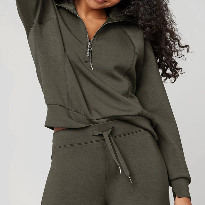 - This lounge tracksuit comprises a half-zip sweatshirt and high-waist wide-leg sweatpants.