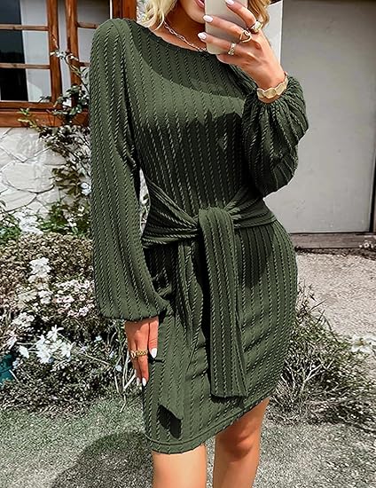 💃Last Day 50% OFF⏰Women's Long Lantern Sleeve Tie Waist Rib Knitted Knit Sweater Dress